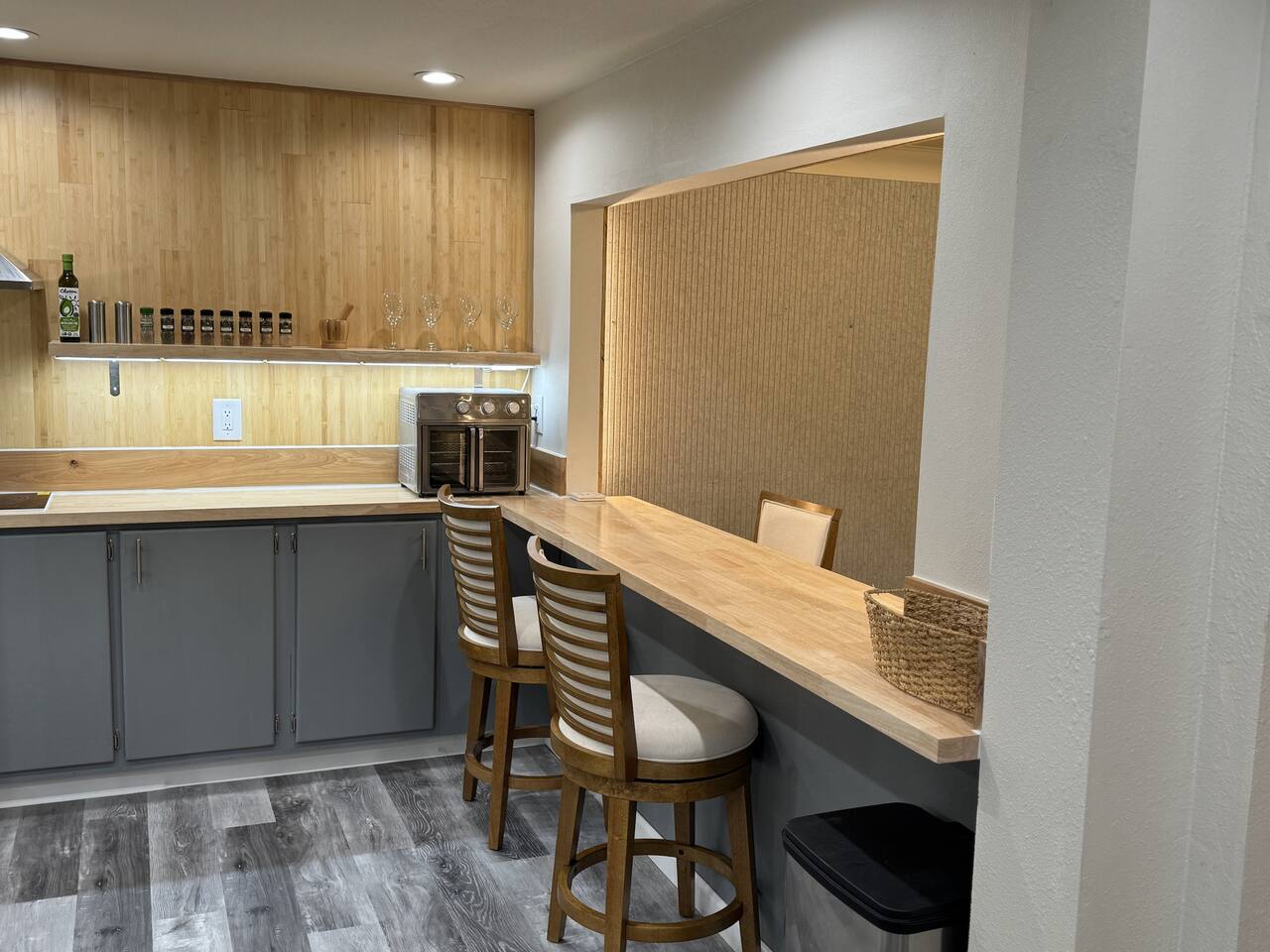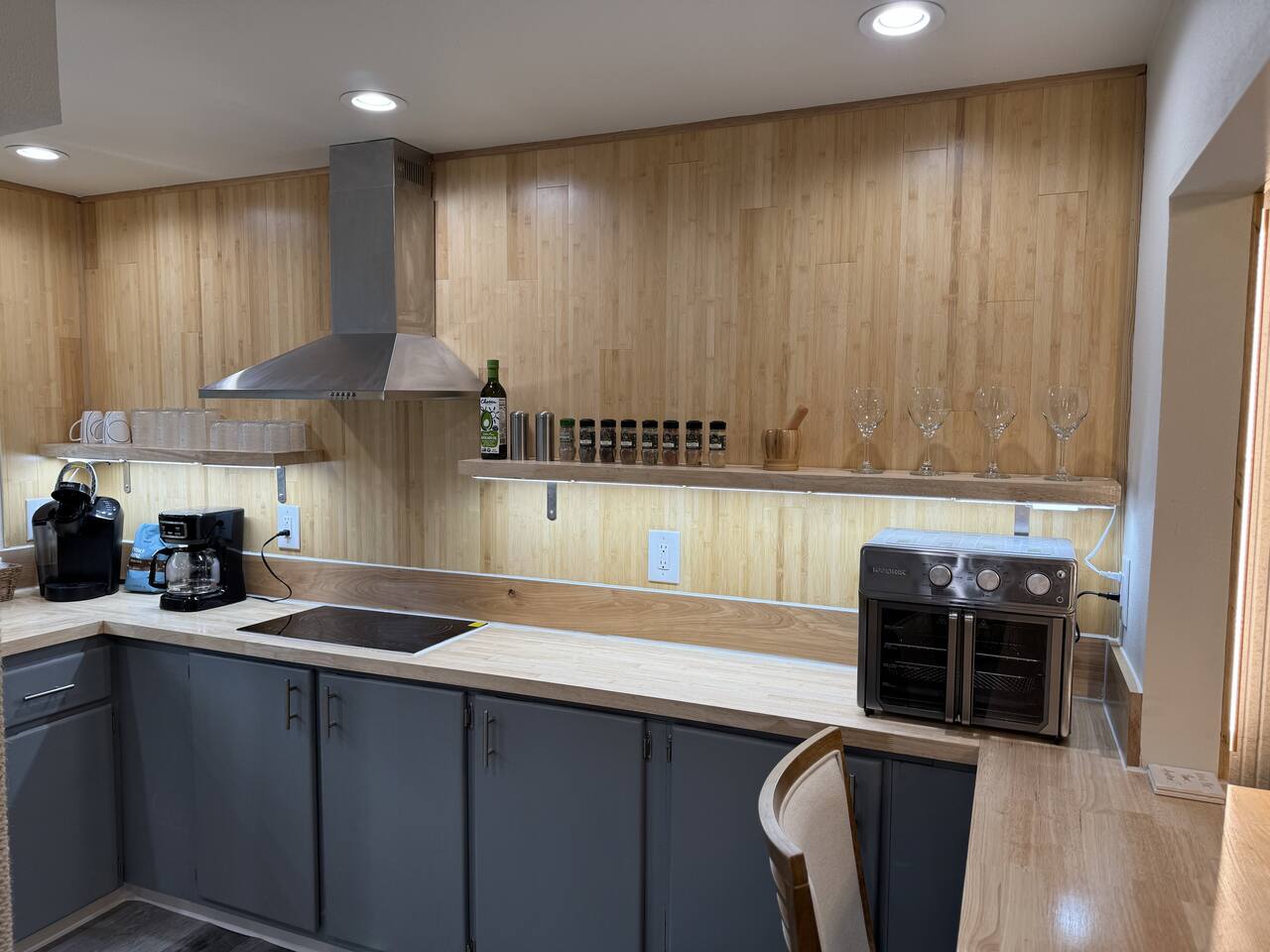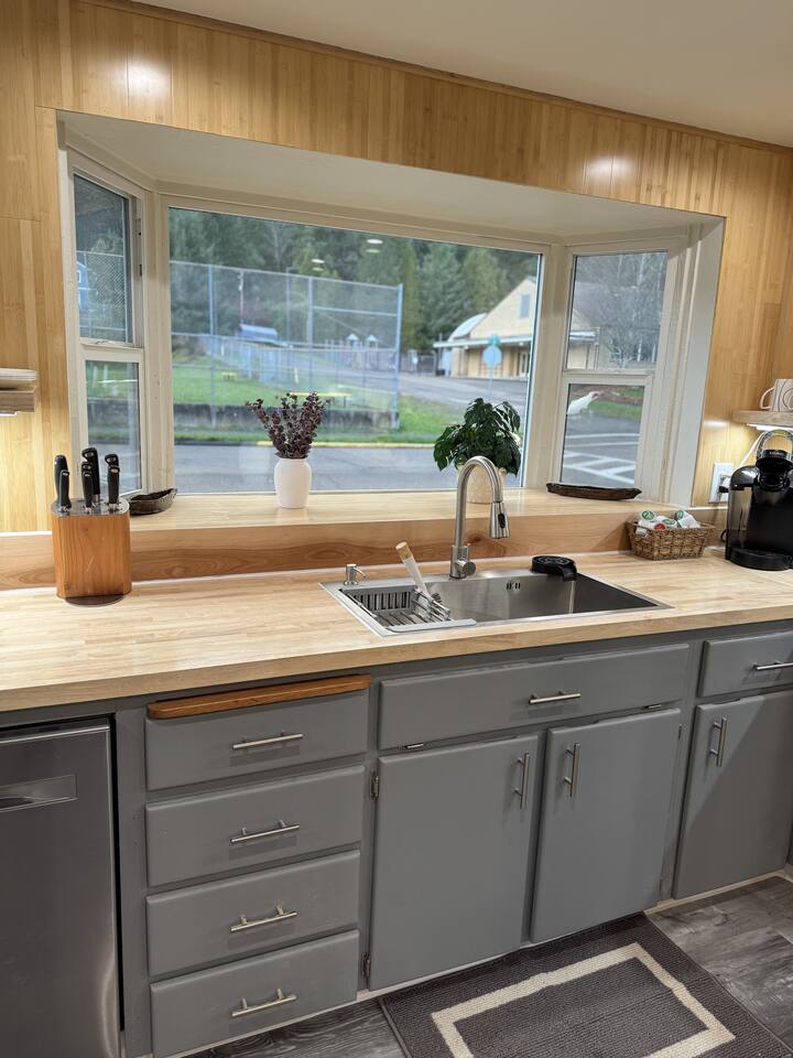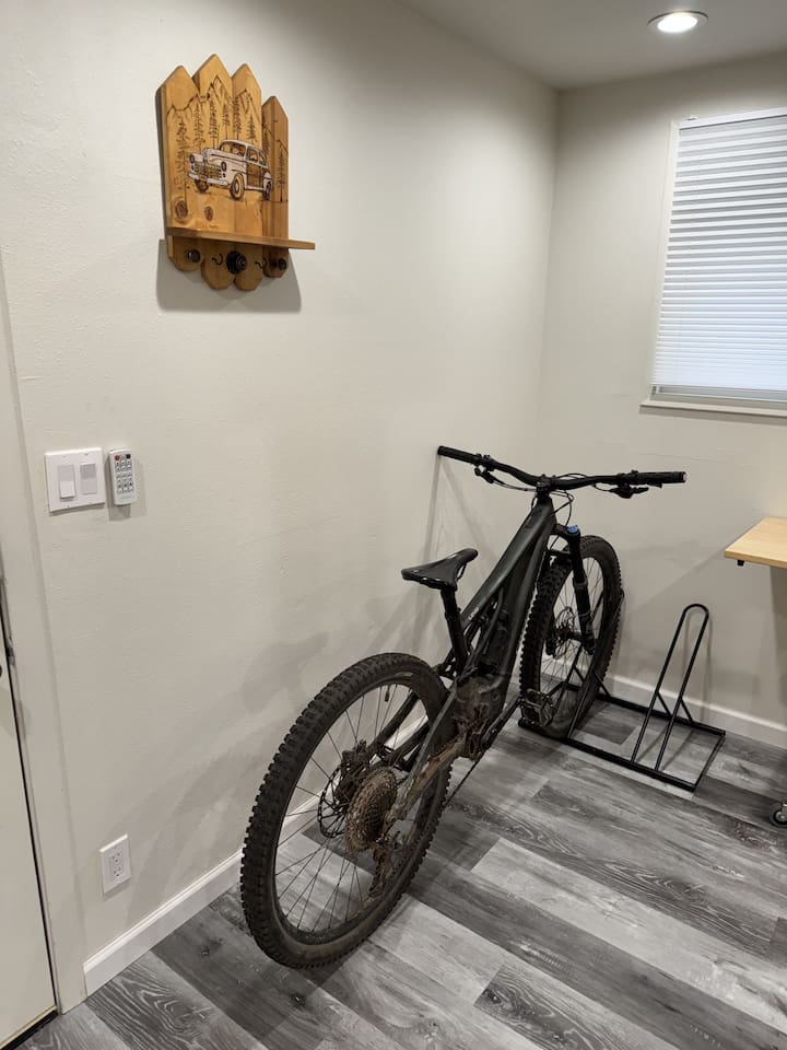 Welcome to your stylish and centrally-located getaway in Oakridge! This recently remodeled apartment offers a warm, welcoming atmosphere with modern touches like light wood paneling and contemporary lighting throughout. The space is perfect for up to two guests. Living & Kitchen: The beautiful, fully-equipped kitchen features butcher block countertops and updated stainless steel appliances, perfect for preparing a meal. Bedroom: In the serene bedroom, you'll find a cozy queen-sized bed with dimmable lighting to create the perfect ambiance for a restful night's sleep. Workspace: For those mixing work and pleasure, a dedicated office nook with a desk and chair provides a quiet space to focus. Bathroom: Refresh in the modern bathroom, which includes a luxurious rain-style showerhead and a heated mirror for an extra touch of comfort.