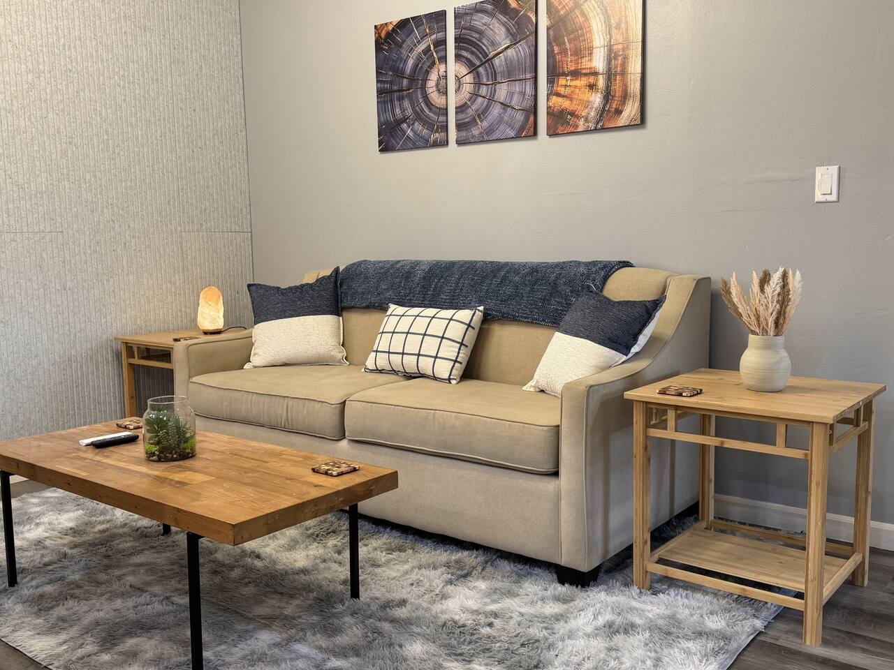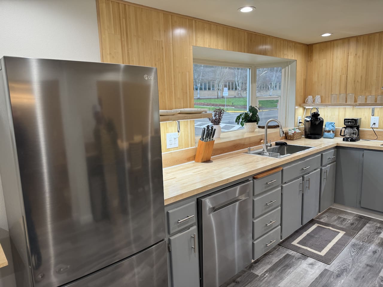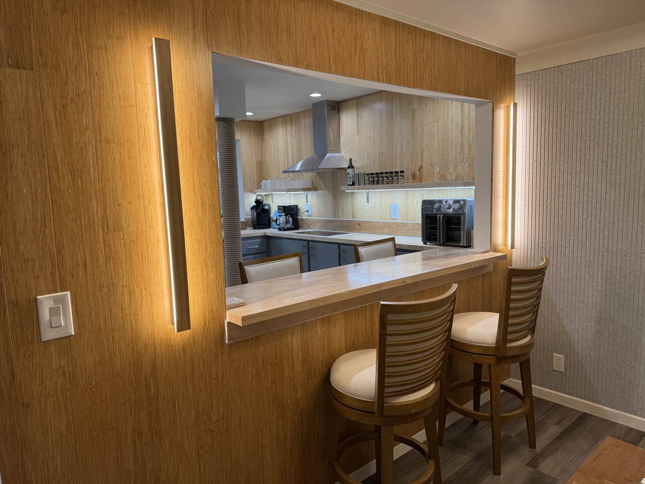 Welcome to your stylish and centrally-located getaway in Oakridge! This recently remodeled apartment offers a warm, welcoming atmosphere with modern touches like light wood paneling and contemporary lighting throughout. The space is perfect for up to two guests. Living & Kitchen: The beautiful, fully-equipped kitchen features butcher block countertops and updated stainless steel appliances, perfect for preparing a meal. Bedroom: In the serene bedroom, you'll find a cozy queen-sized bed with dimmable lighting to create the perfect ambiance for a restful night's sleep. Workspace: For those mixing work and pleasure, a dedicated office nook with a desk and chair provides a quiet space to focus. Bathroom: Refresh in the modern bathroom, which includes a luxurious rain-style showerhead and a heated mirror for an extra touch of comfort.